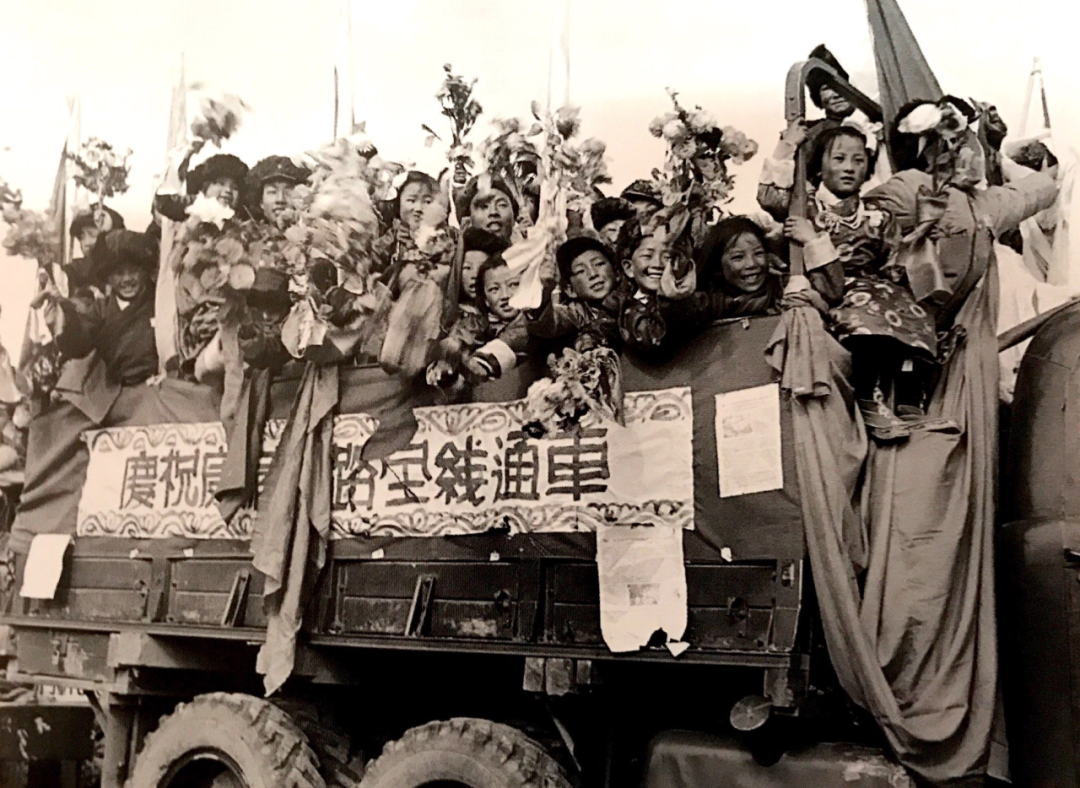 载着藏族少年的汽车驶进川(康)藏、青藏公路通车典礼庆祝会场。