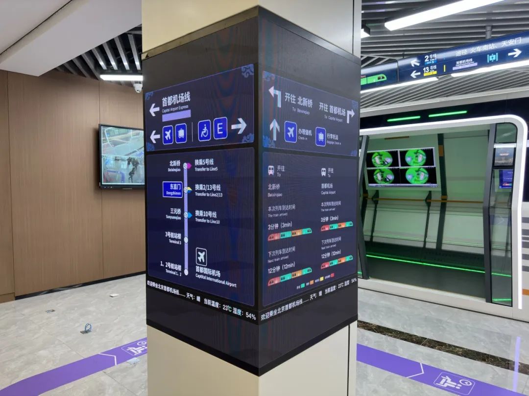 走进下一代地铁实验室,科技感满满的智慧车站和智慧车厢分外亮眼。在候车区,环柱上的显示屏是北京地铁的动态信息发布平台。乘客不仅可以获取清晰的出行指引、天气预报、空气湿度等信息,还能了解列车到站时间、每节车厢拥挤程度,根据提示信息选择车厢乘坐。