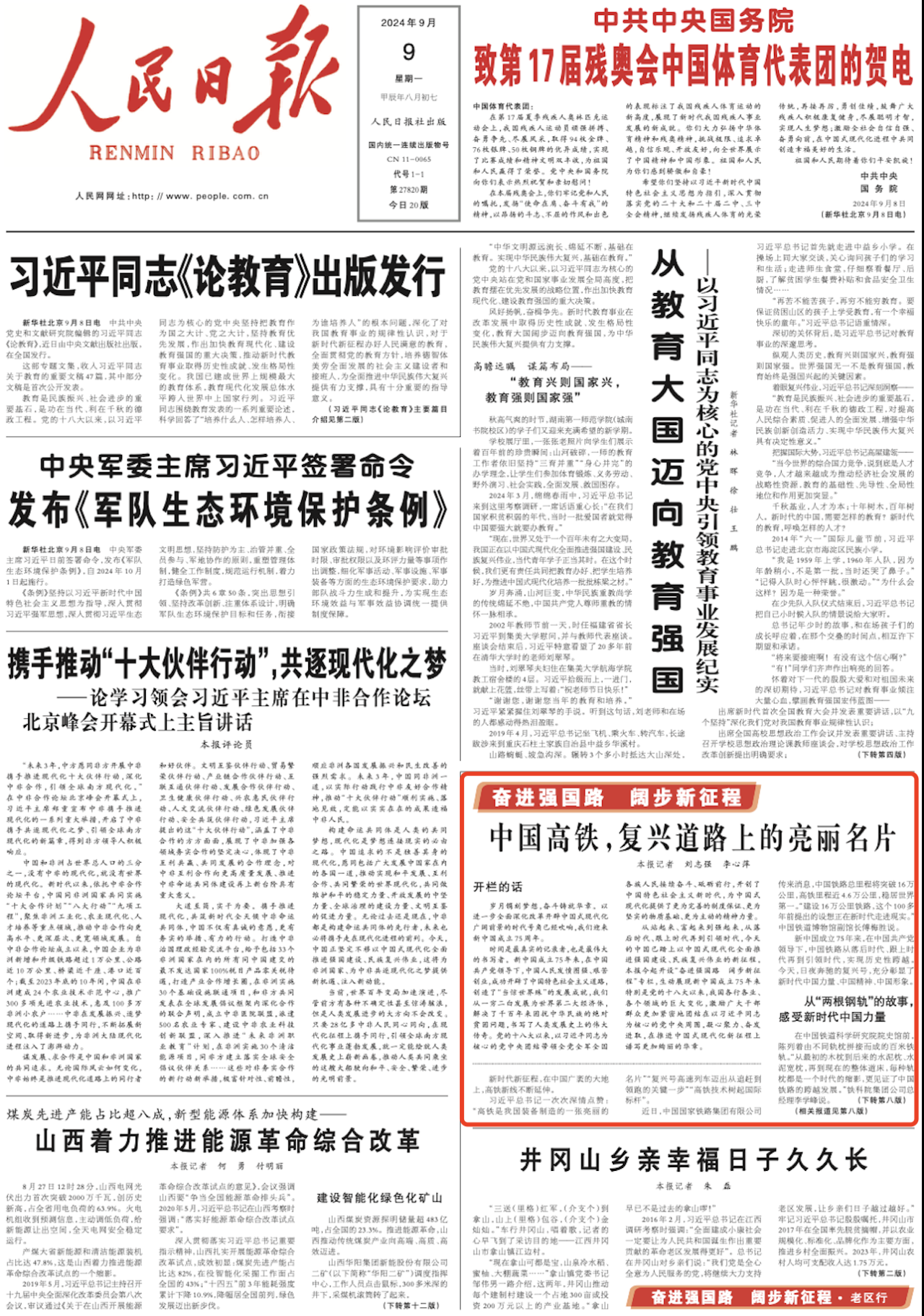 9月9日,《人民日报》头版“奋进强国路 阔步新征程”专栏刊发《中国高铁,复兴道路上的亮丽名片》一文,并以《复兴号奔驰在祖国广袤的大地上》为题在要闻版进行了整版报道。两篇文章刊载如下: