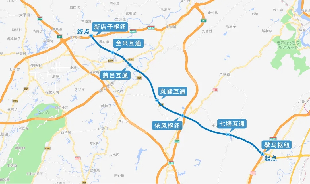 据渝遂复线建设方中铁建重庆投资集团介绍,渝遂复线起于北碚区歇马街道,经北碚歇马,璧山七塘、依凤,铜梁岚峰、蒲吕,止于铜梁区东城街道新店子,与重庆三环高速铜梁至合川段相接,路线全长27.2公里,采用双向六车道高速公路标准建设,设计速度120公里/小时。
