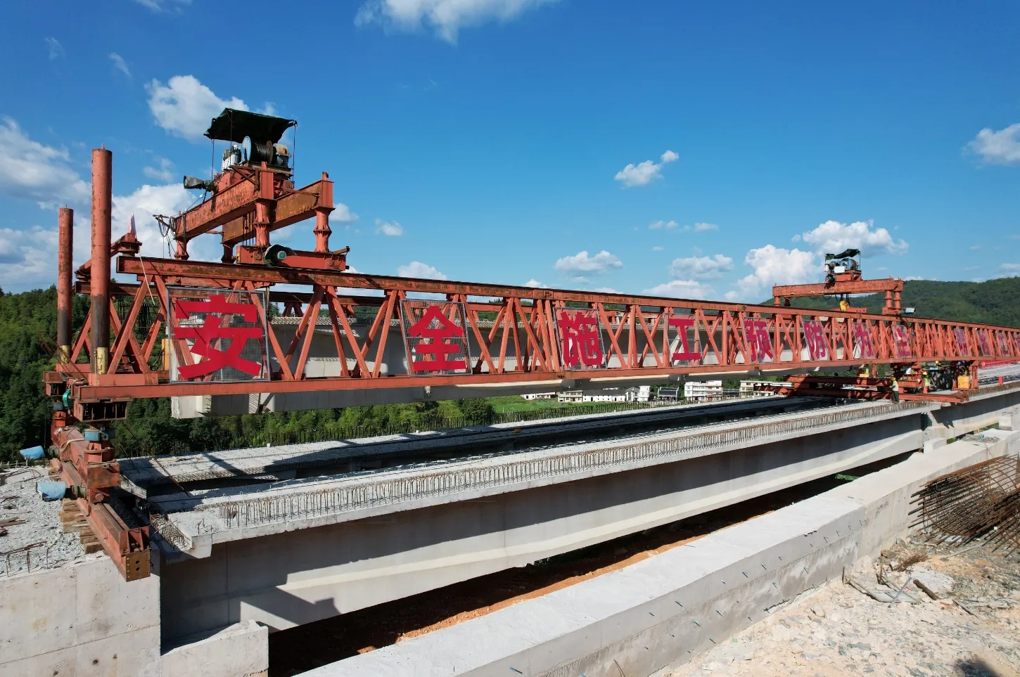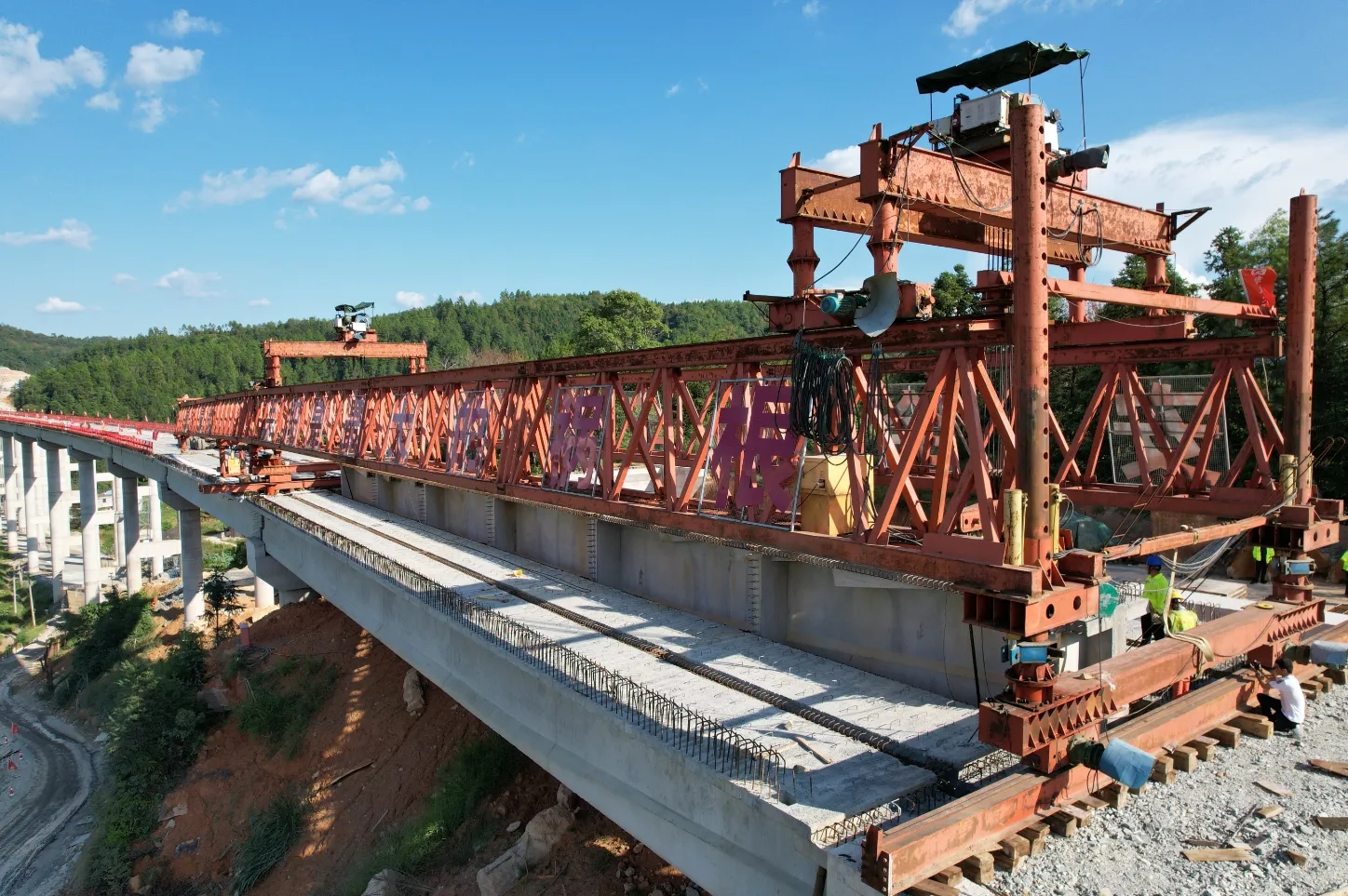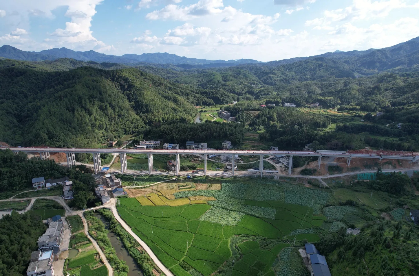 9月9日,在瑞金市瑞林镇大坋村,随着最后一节梁段徐徐吊起,缓缓放入合龙口,瑞兴于快速交通走廊(瑞金段)项目大坋大桥顺利实现右侧贯通。