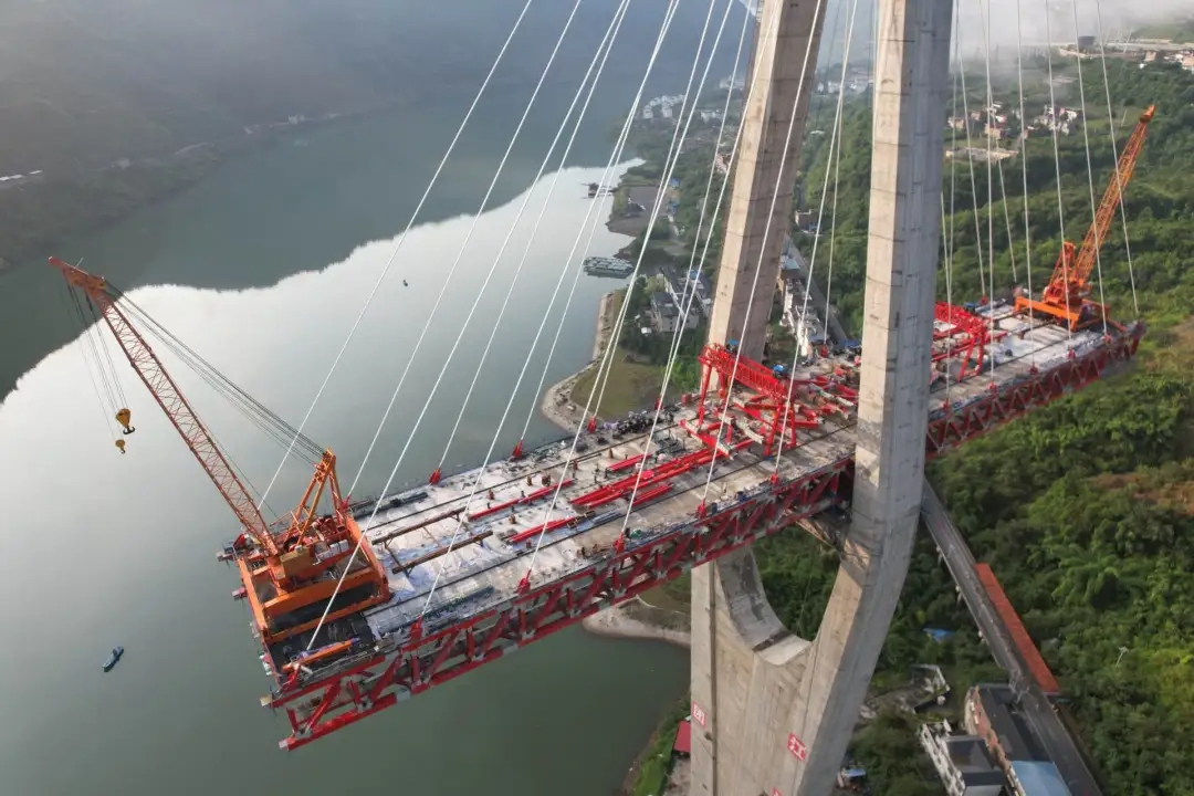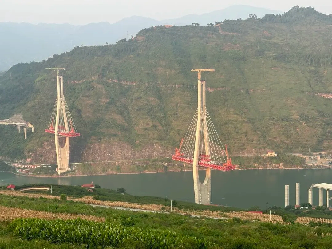 新市金沙江特大桥作为沿江高速新市至金阳段绥江支线跨越金沙江的一座特大桥,是沿江高速的关键性控制工程。大桥起点岸为四川省宜宾市屏山县新市镇,止点岸为云南省昭通市绥江县南岸镇,全长1867米,主桥采用双塔三跨钢桁梁斜拉桥,是目前四川同类型在建规模最大、技术难度最高的钢桁梁斜拉桥。