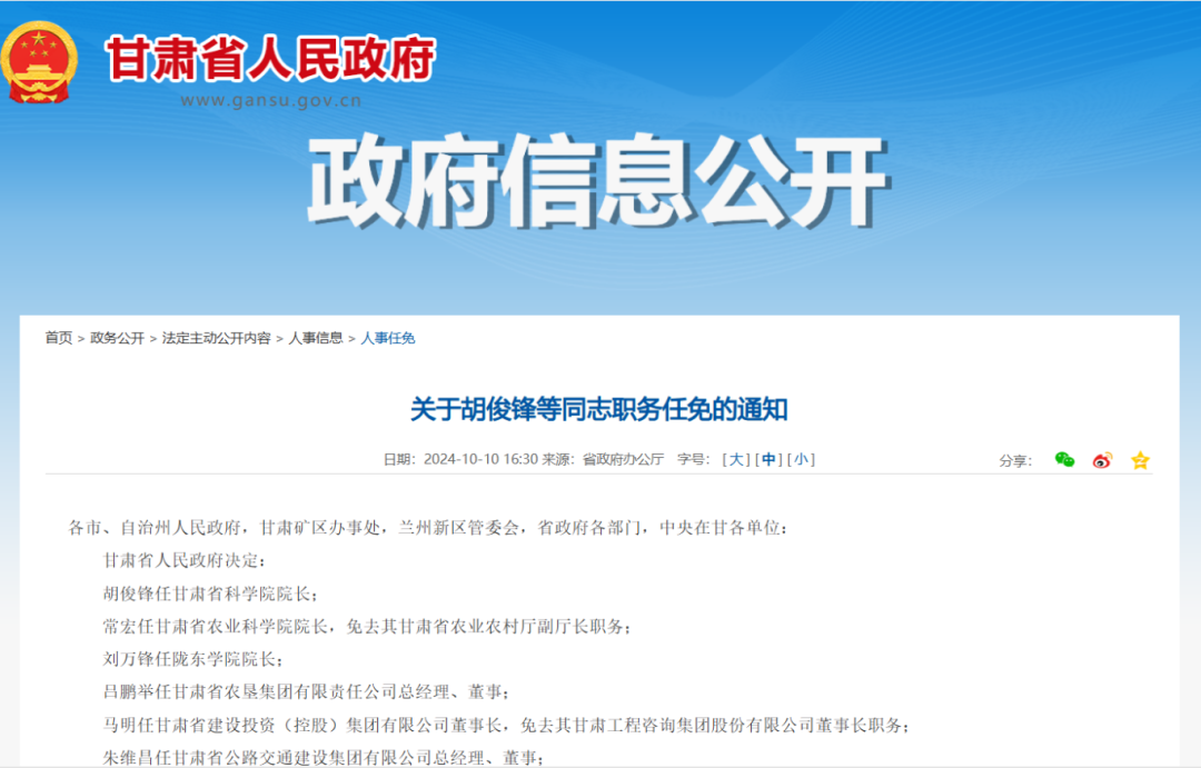10月10日,甘肃省人民政府网站发布关于胡俊锋等同志职务任免的通知。甘肃省人民政府决定任命朱维昌为甘肃省公路交通建设集团有限公司总经理、董事。
