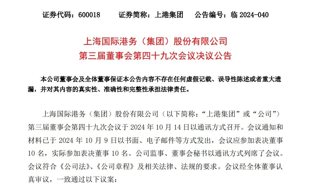 10月14日,上海国际港务(集团)股份有限公司(证券代码:600018 ,简称“上港集团”)发布《第三届董事会第四十九次会议决议公告》。