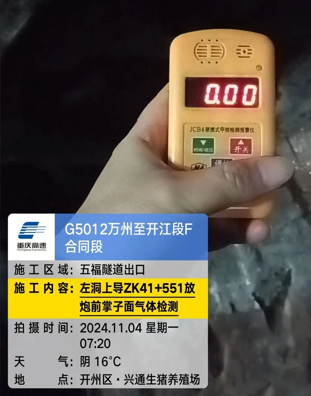 五福隧道全隧穿越有岩溶、瓦斯、采空区、老窖等不良地质,属低瓦斯隧道,瓦斯段占比12%,存在较大施工风险。为此万开达基层项目部制定了专项方案并邀请专家进行会审,并指导施工。同时加强与其他项目沟通协调,配备专职人员,采用气体自动监测系统实时在线监测瓦斯等有毒有害气体,按照2小时/次的频率开展人工巡回检查,确保瓦斯段落施工安全。