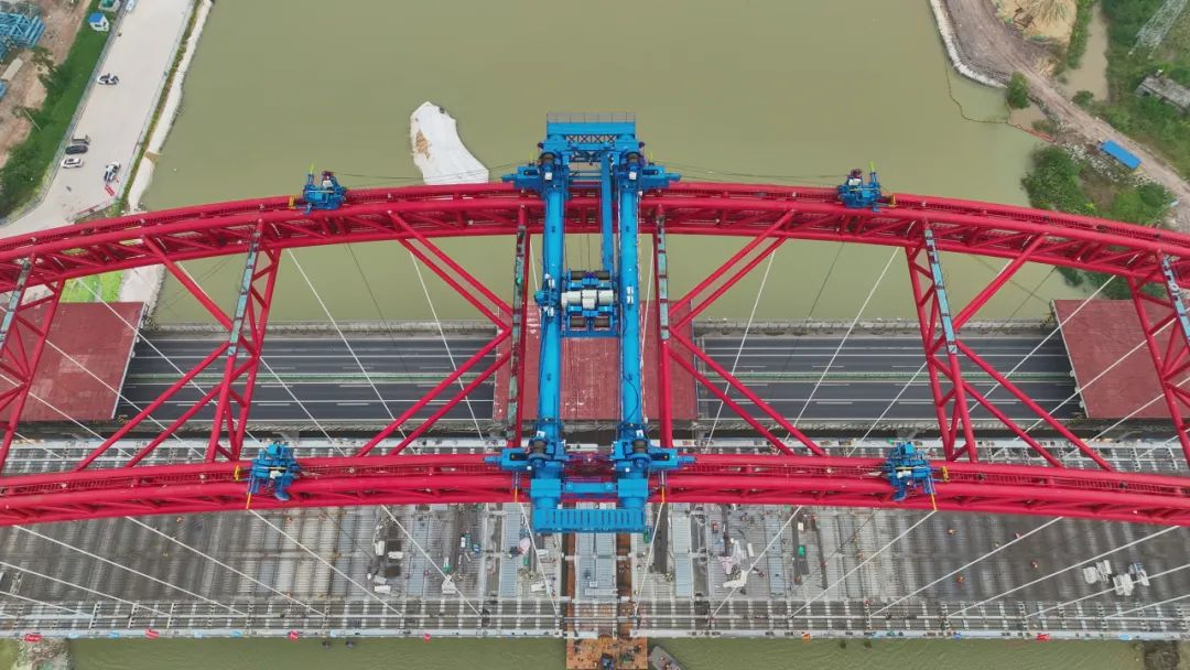 平陆运河G75兰海高速钦江大桥建设采用半幅通车半幅施工形式。该大桥右幅格子梁共有25节段,为确保吊装施工顺利推进,平陆运河建设管理团队创新研发应用爬拱吊机,并采取东西岸对称、交替的方式进行安装。爬拱吊机的“吊点智能调节系统”可保证格子梁在起吊过程中四个吊点平稳且受力均匀,实现格子梁高精准对接,进一步提高吊装效率,保证吊装过程的质量和精度。