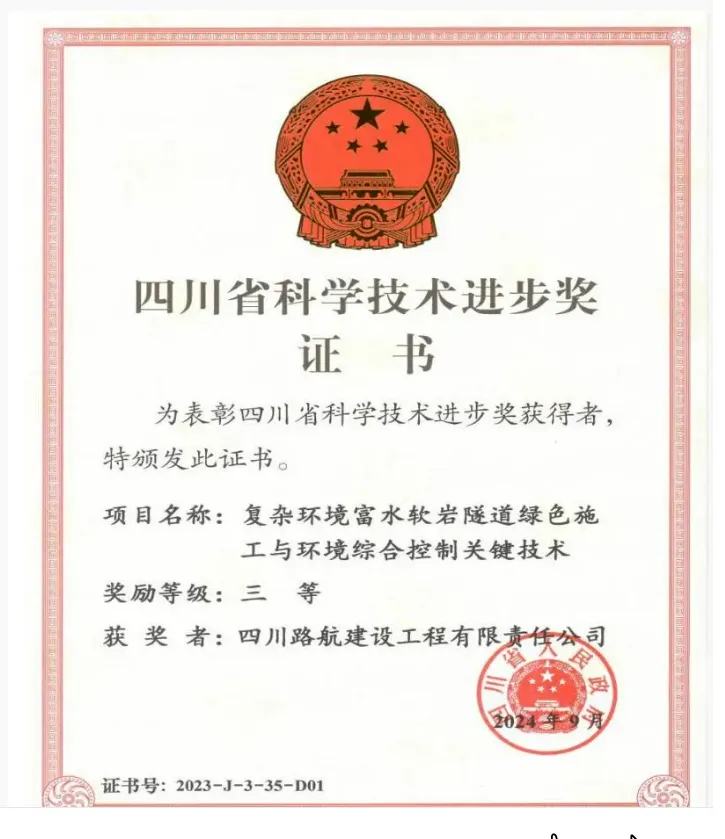 为有效提升富水、软岩复杂环境下隧道施工的机械化、智能化、绿色化水平,四川路航建设工程有限责任公司牵头开展了《复杂环境富水软岩隧道绿色施工与环境综合控制关键技术》项目研究,形成复杂环境富水软岩隧道绿色施工与环境综合控制成套技术,项目荣获2023年度四川省科技进步奖三等奖。