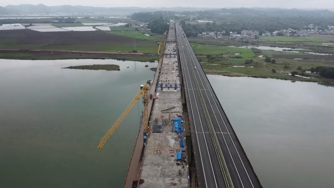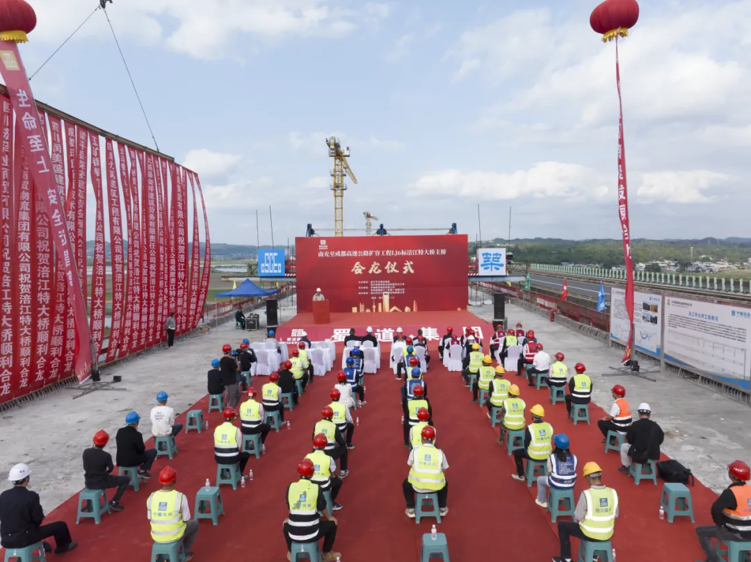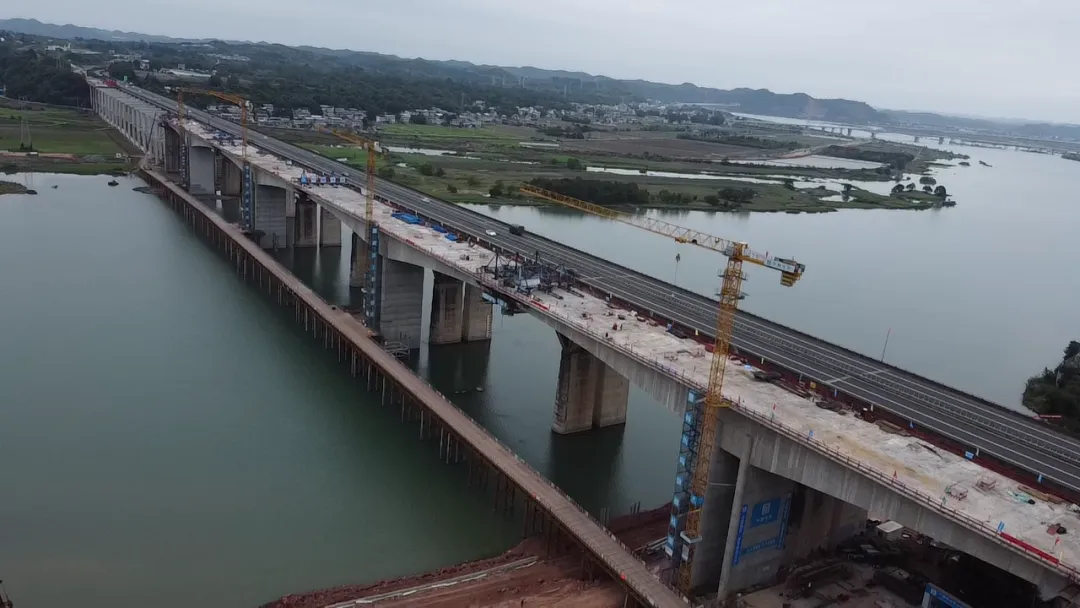成南扩容项目新建桂花涪江特大桥位于遂宁市船山区,跨越涪江和247国道,全长1.26公里,是为缓解成南高速公路通行压力在既有老桥右侧新建的桥梁,主桥长666.8米,采用预应力混凝土连续刚构形式,设计时速100公里/小时。桂花涪江特大桥于2022年下半年正式开工,历时两年零三个月较计划提前40天完成了主桥合龙。
