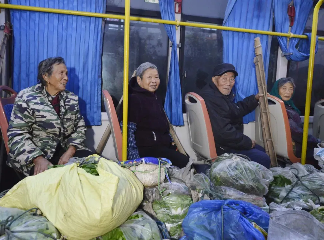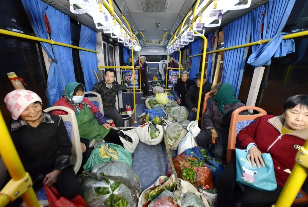 晨光熹微,公交车在乡间道路上平稳地行驶着。车厢里,有的人闭眼小憩,有的人交流一下收成,有的聊聊身边的新鲜事,还有的小心整理着菜品。说话间,车子陆续经过上周村、电厂、大姚村等站点,不多时,已经拉了一车的菜农,菜品也越来越丰富,好比一座移动的小菜市。