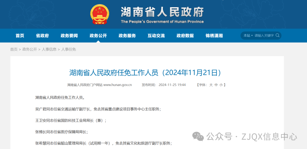 11月21日,湖南省人民政府门户网站发布湖南省人民政府任免工作人员的信息,其中提到:吴广君任湖南省交通运输厅副厅长。