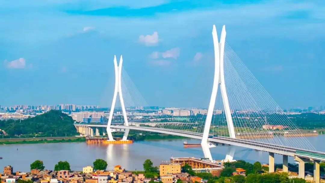 其中,富龙西江特大桥主桥全长1070米,主跨为580米双塔(白鹭塔)双索面钢-UHPC组合梁斜拉桥。