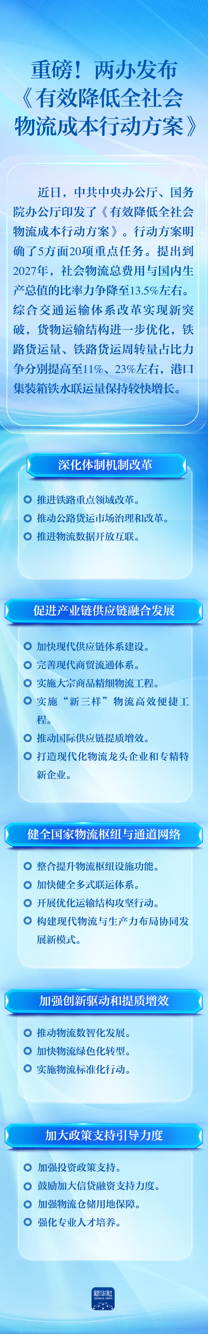 近日,中共中央办公厅、国务院办公厅印发了《有效降低全社会物流成本行动方案》。行动方案明确了5方面20项重点任务,事关你我他,事关全社会。戳图,速览!