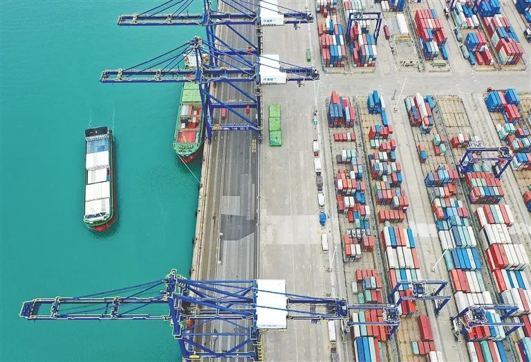 集装箱货轮在海南洋浦国际集装箱码头装卸货物。新华社记者 郭程 摄
