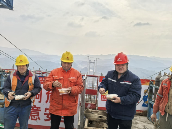 为赶在2024年12月26日完成主缆施工,建设者自愿加班加点。午间,大伙一块,站在索塔吃盒饭。