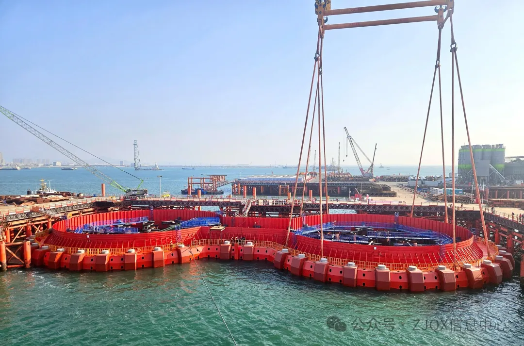 厦金大桥(厦门段)项目为福建省重点工程,全长约19.62公里。其中,刘五店航道桥全长1948米,索塔高178.1米,主跨长928米,是福建省内最大的跨径桥梁,也是福建省第一座离岸式海中悬索桥。中交一公局集团承建刘五店航道桥东锚碇、东主塔,为海上全离岸施工。东主塔钢套箱为双壁钢套箱结构,形状呈哑铃型,总长105.8米,总宽为47米,高度为11.3米,总重达4037.5吨。作为桥梁永久防撞设施,钢套箱如同桥墩的“护盾”,能有效缓冲船舶等水上交通工具对桥墩的意外撞击,防止海水对承台的侵蚀,提高桥梁的使用耐久性。施工时,将“护盾”底部和海中桩基相连并固定,浇筑封底混凝土,就可以形成一个小型“人工岛”,为承台提供干作业环境,实现海上施工“陆域化”。1月5日,钢套箱于漳州港中信重工基地启航,沿厦漳海域运输至刘五店航道桥施工区域,航程约21海里(约38.9公里),耗时3个小时。钢套箱施工采取分幅安装的形式,先进行左幅套箱安装锁定后,再进行右幅套箱安装工序,最终实现合龙。