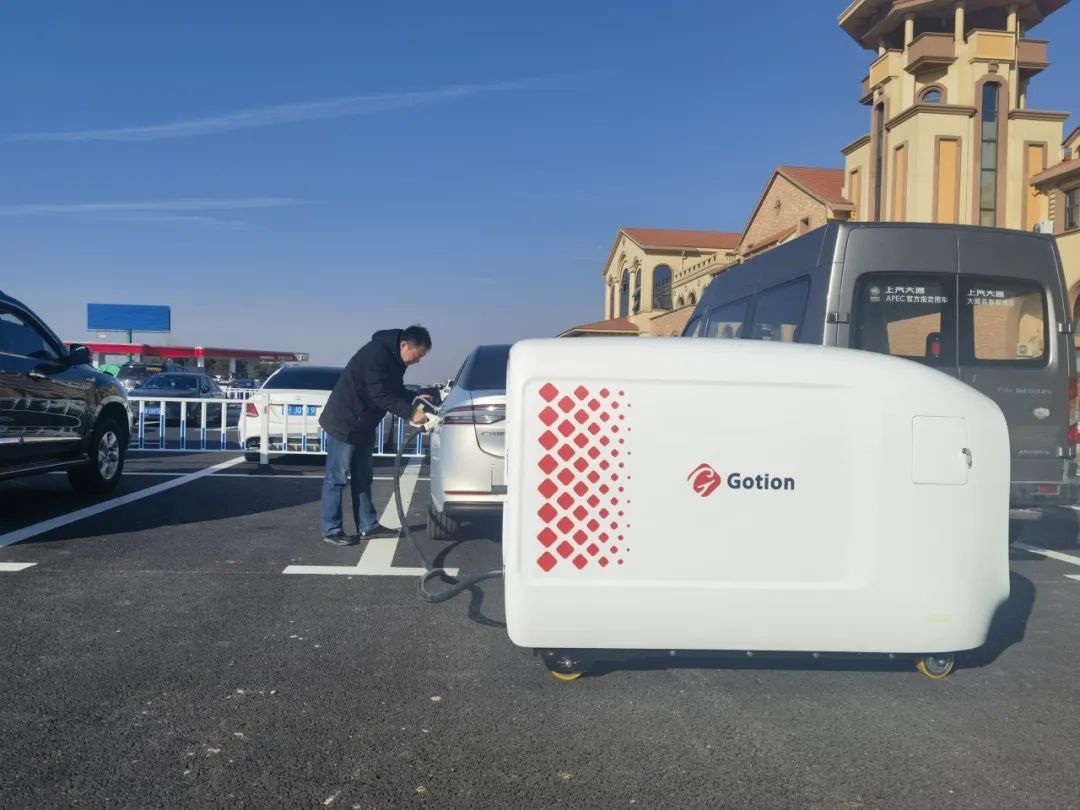 新能源车主用移动充电机器人为爱车充电。
