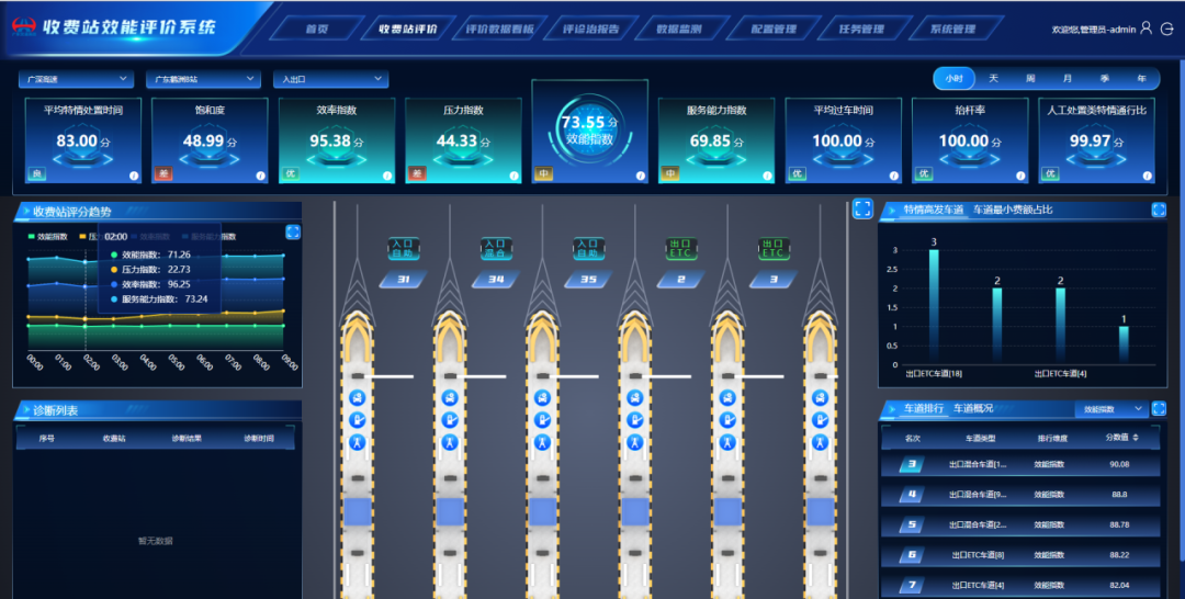 升级改造后的鹤洲站还在出入口广场上线了收费站效能评价系统,可收集站点负荷状态、平均关键通行时间、平均交易等待时间、特情状态等十九项指标,全天候实时监测站点的运行状况,可量化评估收费站的健康度、压力、效率、服务能力等指标。