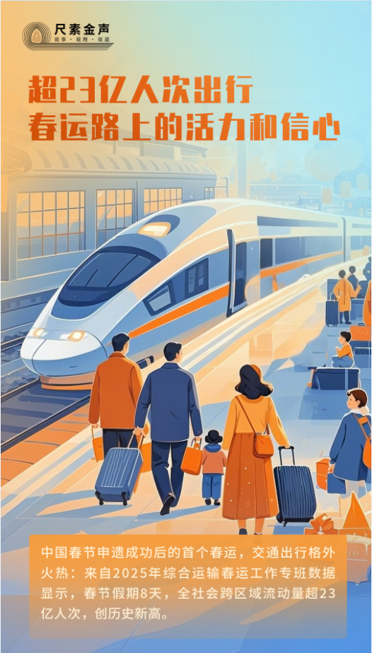 中国春节申遗成功后的首个春运,交通出行格外火热:来自2025年综合运输春运工作专班数据显示,春节假期8天,全社会跨区域流动量超23亿人次,创历史新高。