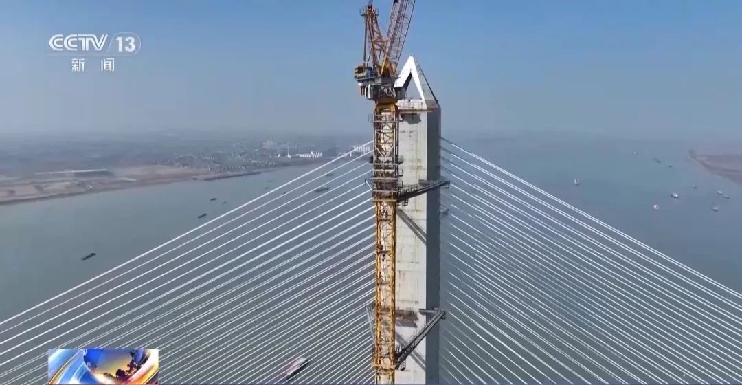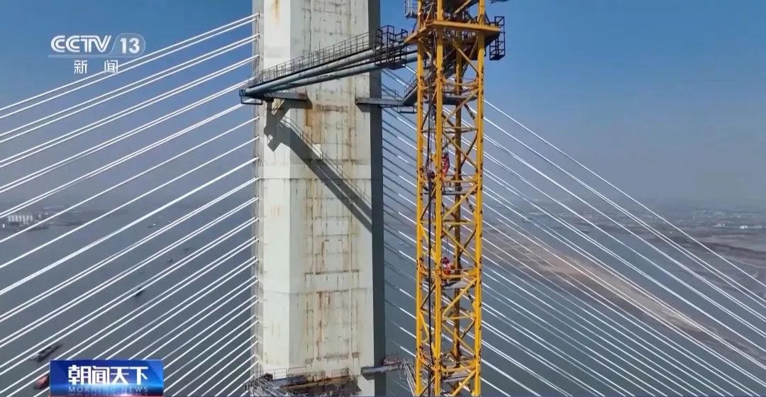 总台央视记者 李伟代:这就是用于世界最大跨度斜拉桥桥塔施工的超高塔吊,常泰长江大桥高达350米的主塔已经建成,师傅们徒手在塔吊上继续攀爬120米,到达离江面380米的塔吊顶端,对塔吊进行拆除前的全面检查。