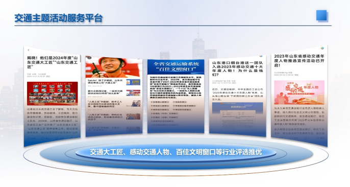 这是一个交通主题活动服务平台。山东大交通平台将成为交通大工匠、感动交通人物等行业评选推优的主要挖掘、展示、宣传平台,还将打造交通智库沙龙、交通宣传培训等各类主题活动。同时,依托大众报业集团自主研发的舆情态势感知系统,能向合作伙伴提供舆情风险监测服务。
