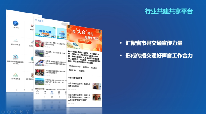 这是一个行业共建共享平台。交通运输系统各企业单位可入驻平台“交通号”,交通号基于大众报业集团全国领先的党媒大模型创建,除了可以上传发布图文、视频等全媒产品之外,还免费开放AI智能审校、AI辅助创作功能模块,登录交通号就可以与大众报业集团采编人员共享海量媒体资源库。