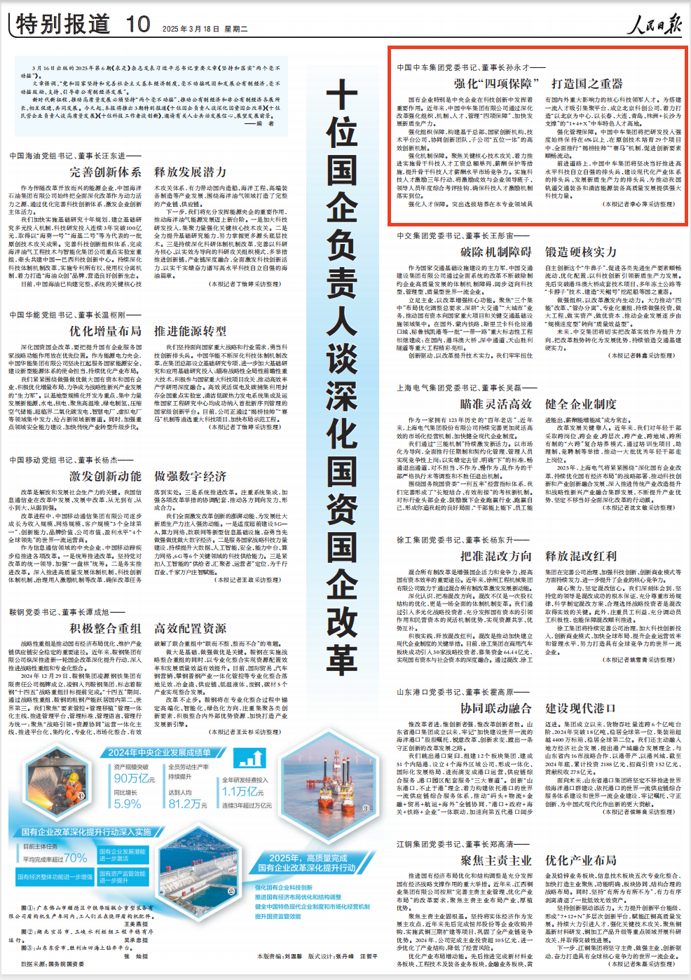 3月18日,《人民日报》推出特别报道——《十位国企负责人谈深化国资国企改革》,邀请有关人士共话发展信心、展望发展前景。报道刊发了中国中车集团党委书记、董事长孙永才《强化“四项保障”打造国之重器》一文,详细阐述了中国中车通过深化改革强化组织、机制、人才、管理“四项保障”,以加快发展新质生产力的具体举措。现将文章转载如下: