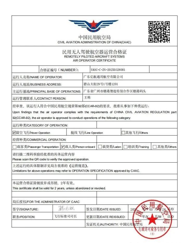 OC(Operation Certificate)是民航局向运营商颁发的资质证明,标志着企业具备安全、合规开展商业飞行的能力。若将低空经济比作 “造车”,适航三证(TC/PC/AC)解决了 “车能造” 的问题,OC则决定了 “车能上路”。