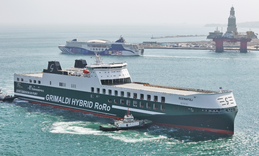 “那不勒斯港”轮全长238米、型宽34米,配备7层甲板(含2层可升降甲板),可装载7800米车道货物,相当于500辆拖车与180辆汽车的综合运力。该船创新采用世界技术领先的双低速机与双CPP桨联合驱动系统,配合智能能效管理系统,在保持相同航速的前提下,单位运输量碳排放较上一代船型降低50%,是全球最大环保型短途运输滚装船。