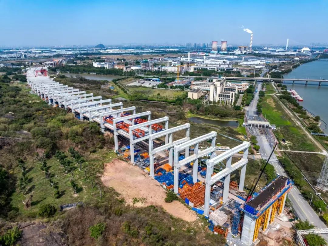 此外,在每个节段间的竖向主钢筋连接上,项目采用国内自主研发的轴向冷挤压套筒新型工艺,即将两根待连接钢筋的端头放入圆形套筒,再利用挤压设备向内收缩套筒,钢筋肋部就能与筒内凹槽紧紧咬合。相较传统焊接方式,“无火”作业的新工艺能在提升工效和质量的同时,大大地降低安全风险。