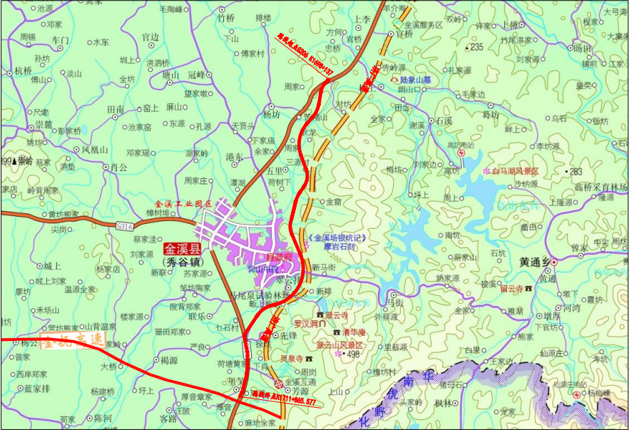 G206金溪绕城改建工程起点位于金溪县陆坊乡大岭村附近,经梅家、里汪村、三源村、新安村、头亭村、翠云排村、义仓下村、过下肖村,终于大塘杨家村附近,全程13.78公里。该项目采用双向四车道一级公路标准,设计行车速度为80km/h,路基宽度25.5米,沥青混凝土路面。