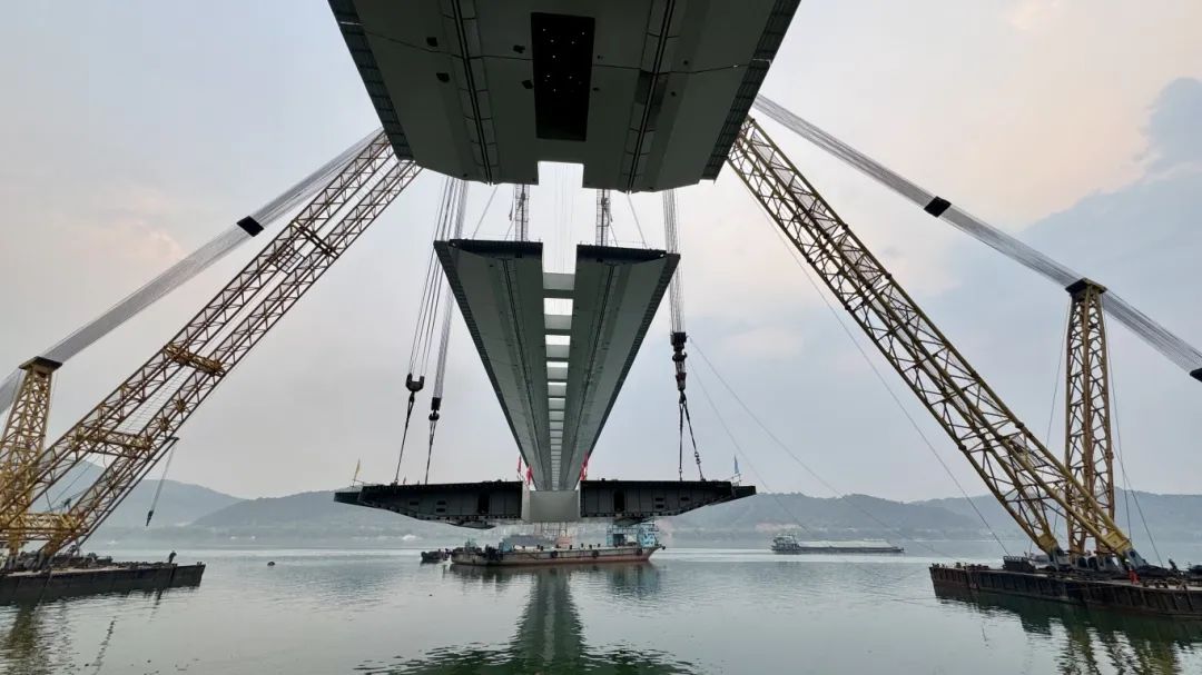 苍容浔江大桥主梁为分离式钢箱梁,共计7种类型、71榀,左右幅采用5米连接箱进行横向刚性连接。本次合龙段钢箱梁为南跨SZ4梁段,采用550t+660t起重船吊装,合龙口仅有20厘米富余宽度,对起重船的定位及吊装精度要求高。项目利用桥梁吊索可调节的特性,在合龙前通过调整南跨SZ2梁段和SZ3梁段的索长,使两端合龙口高差由40厘米调节至2厘米,规避了采取主梁压重措施可能带来的倾覆风险,实现了大桥主梁高精度合龙。