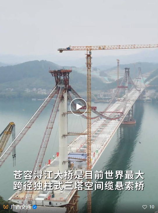 【广西】世界最大跨径独柱式三塔空间缆悬索桥——苍容浔江大桥顺利合龙