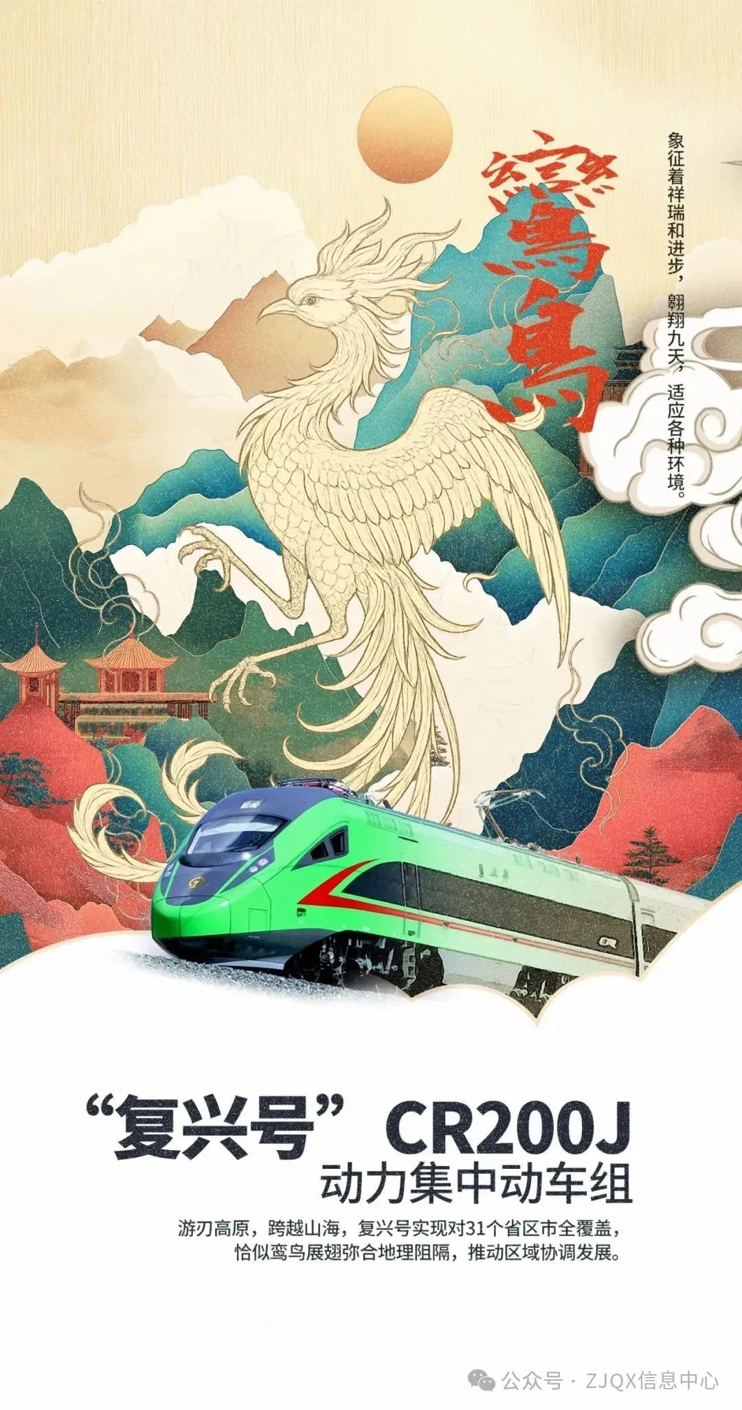 “复兴号”CR200J动力集中动车组:游刃高原,跨越山海,复兴号实现对31个省区市全覆盖,恰似鸾鸟展翅弥合地理阻隔,推动区域协调发展。