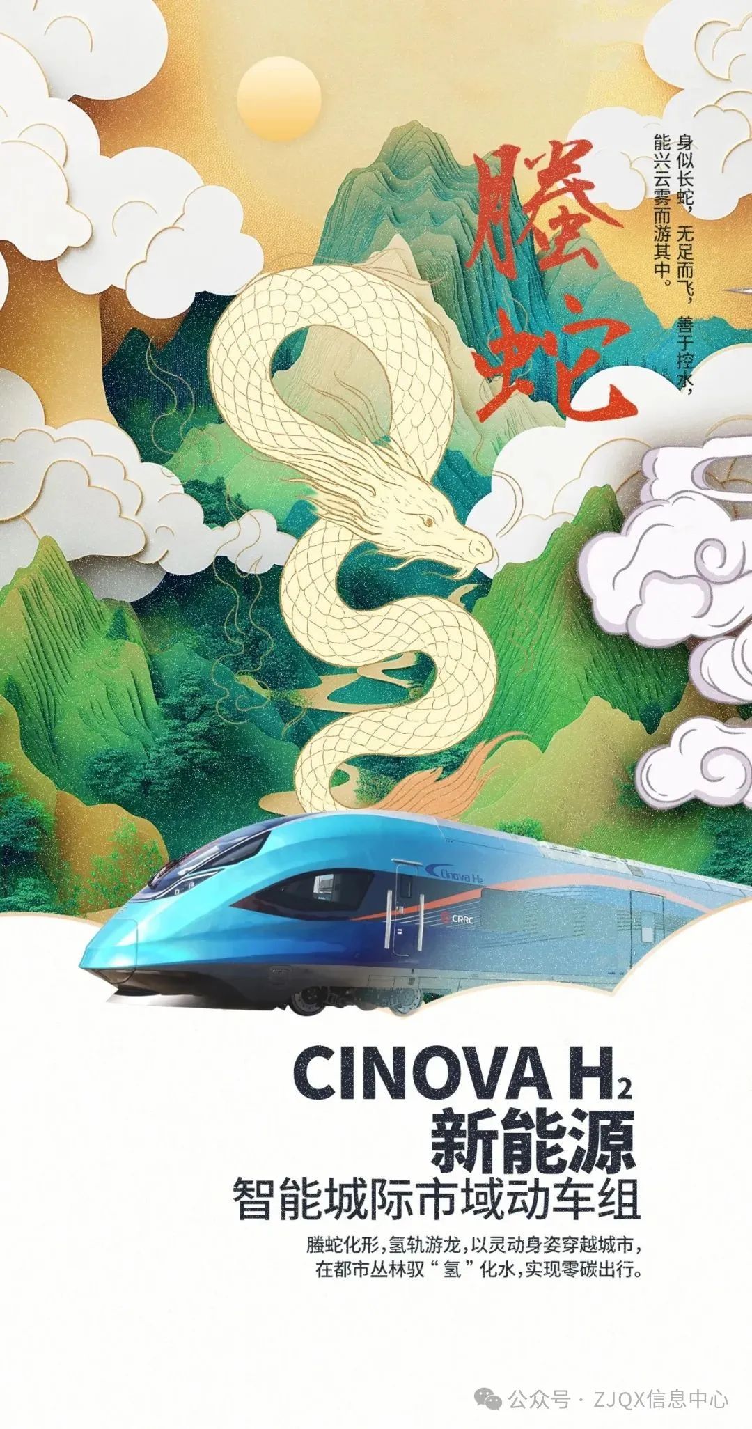 CINOVA H₂新能源智能城际市域动车组:螣蛇化形,氢轨游龙,以灵动身姿穿越城市,在都市丛林驭“氢”化水,实现零碳出行。