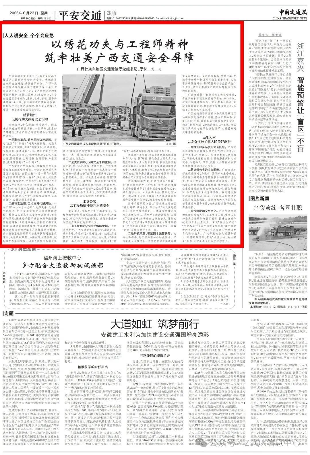 6月23日,《中国交通报》刊登了自治区交通运输厅党组书记、厅长刘可署名文章《以绣花功夫与工程师精神 筑牢壮美广西交通安全屏障》,全文如下: