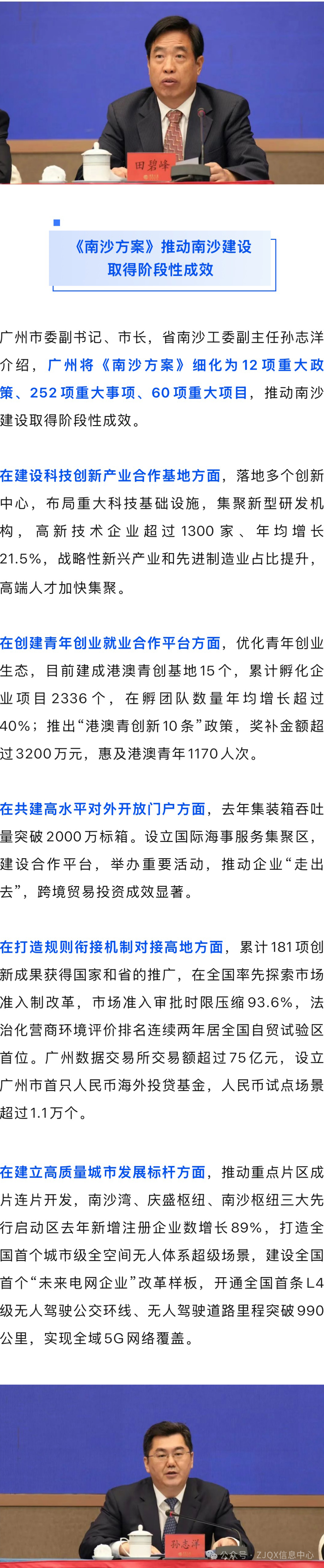 邓鸿介绍,国务院于2022年6月正式印发实施《广州南沙深化面向世界的粤港澳全面合作总体方案》(以下简称《南沙方案》),提出了2025年和2035年两阶段发展目标。2025年是《南沙方案》第一阶段目标收官之年。三年来,南沙开发开放呈现蓬勃生机,创新动能不断增强,战略性新兴产业增加值占GDP比重和先进制造业增加值占规上工业比重分别提升至37.8%和75.9%,与港澳合作更加紧密,服务双循环作用显著增强,在粤港澳大湾区建设中的引领带动作用日益彰显。