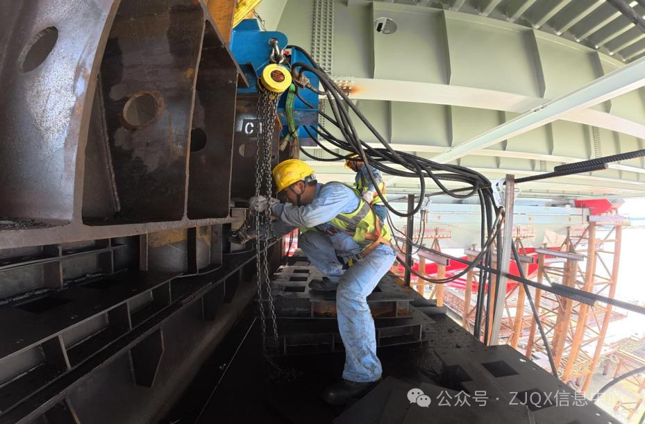 落梁装置采用自主研发的装配式组合落梁钢垫块,通过千斤顶顶升、回落,循环作业不断抽离垫块,使中跨桥面系缓慢下落至设计位置,单次落梁动作最大可下降10公分。落梁过程中,项目团队坚持双向控制原则,落梁实施组控制台实时监测千斤顶顶升力,监控组通过传感器实时复核中跨桥面系受力状态,协同配合保证中跨桥面系落梁结构安全;测量组采用高精度自动追踪全站仪进行偏位及高度控制,测量精度可达0.6毫米,监控组通过位移传感器进行复核。通过管理职责精确到人、实时监测精确到秒、测量精度精确到毫,保证落梁施工精准到位。