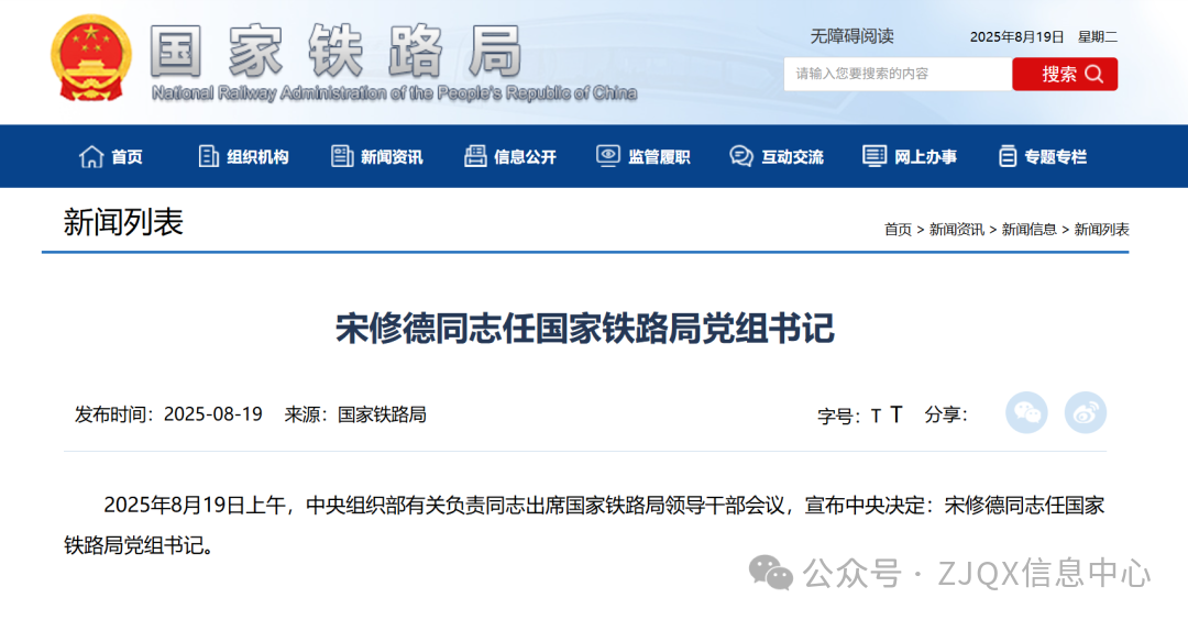据国家铁路局网站消息,8月19日上午,中央组织部有关负责同志出席国家铁路局领导干部会议,宣布中央决定:宋修德同志任国家铁路局党组书记。