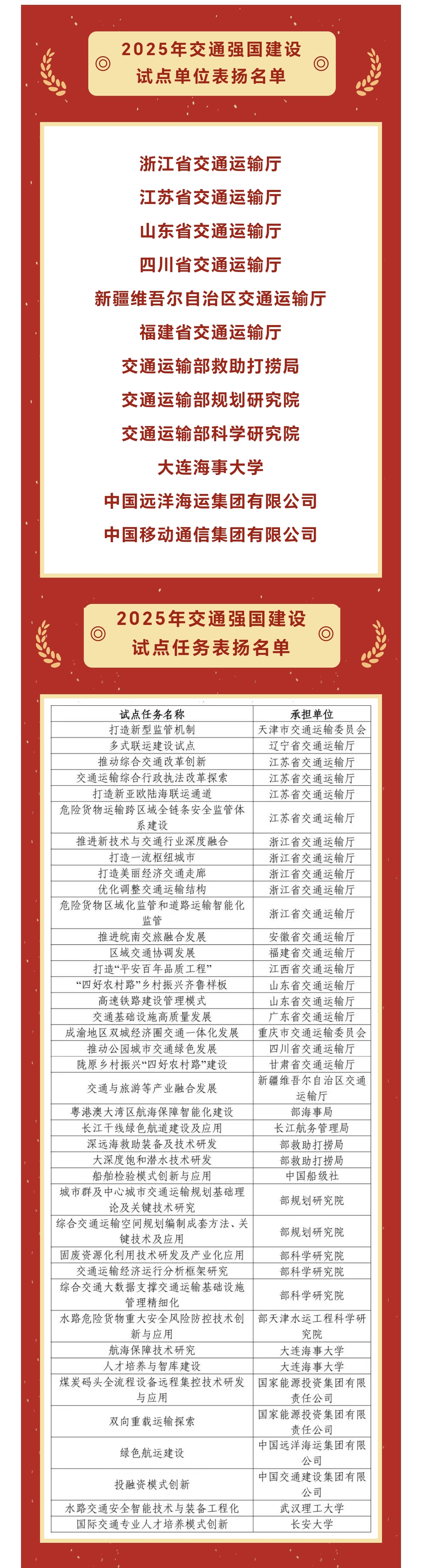 交通运输部从2025年7月底前完成验收评估的87项试点任务中,综合评价任务实施效果、创新引领水平及推广应用情况等因素,决定对浙江省交通运输厅“推进新技术与交通行业深度融合”、江苏省交通运输厅“推动综合交通改革创新”、山东省交通运输厅“高速铁路建设管理模式”等40项试点任务进行表扬。