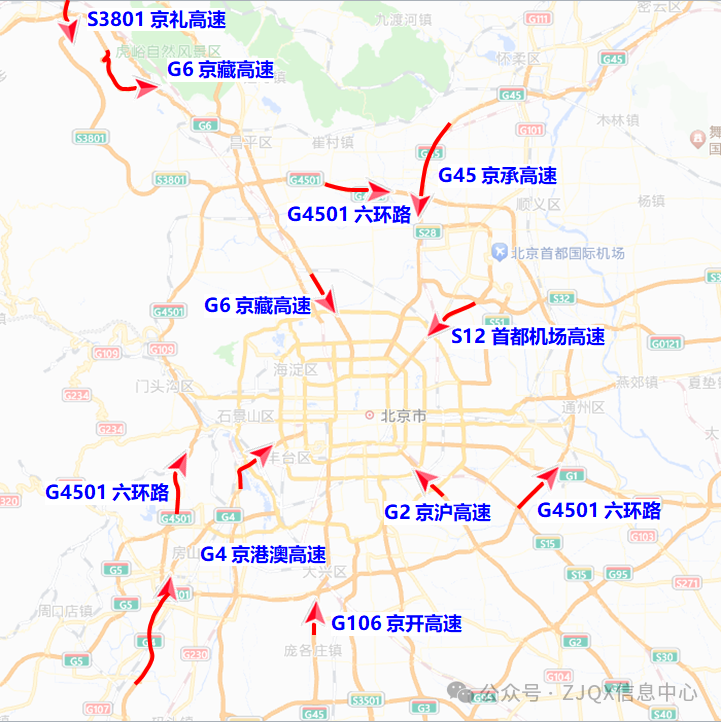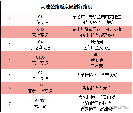 10月8日(假期最后一日)为返程高峰,16-20时高速公路进京方向交通压力集中,京藏、京承、京港澳、京沪、京开、首都机场高速、西六环路等主要高速公路部分路段和京港澳兴礼、京台礼贤、京开榆垡等进京检查站易出现车流集中情况。