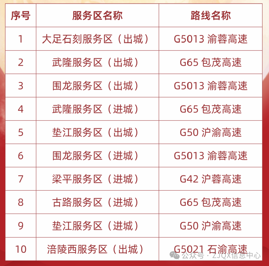 重庆高速梳理了较繁忙的服务区点位,请提前做好行程规划。