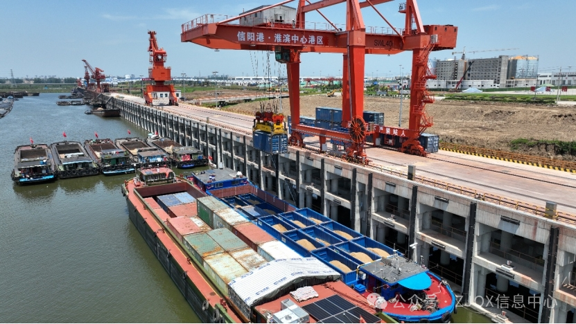 信阳港淮滨中心港区正在进行集装箱装卸作业