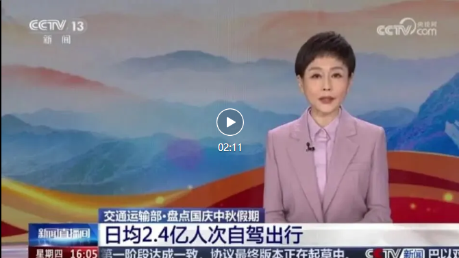 交通运输部运输服务司副司长 高博:今年假期八天,城市群内部跨城串游成为新热点。高铁民航加落地租车的需求激增。根据统计,今年全国各地共投入租赁车辆约一百万辆,日均每天的租出占比超过百分之六十。