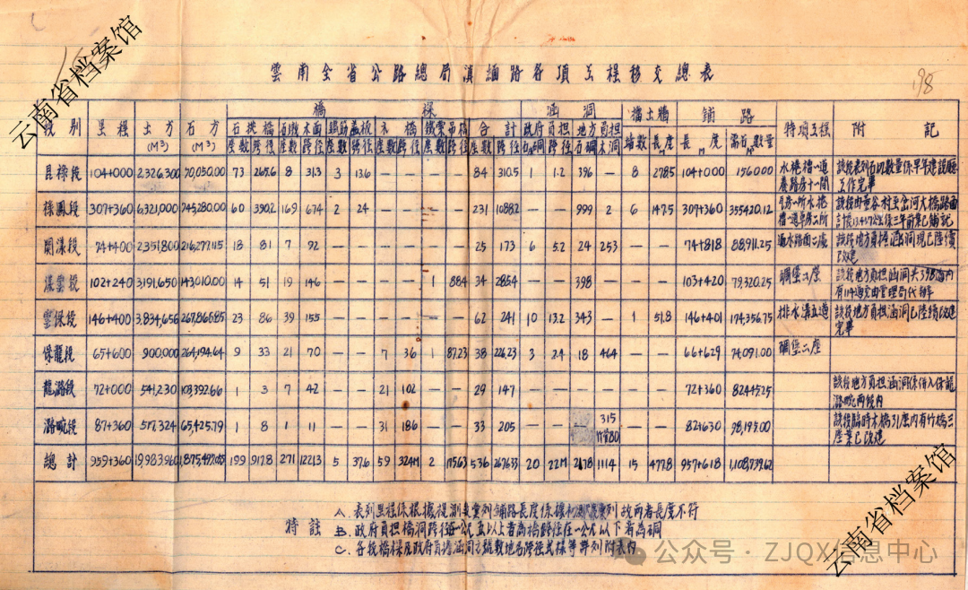 经过大量工程技术人员和劳工艰苦卓绝的奋战,1938年8月底,滇缅公路土路通车,工期仅用时9个月,比计划工期缩短了3个月,创造了令世界瞩目的工程奇迹。据云南省档案馆馆藏档案《云南全省公路总局滇缅公路各项工程移交总表》记载,滇缅公路共有土方199839601立方米;石方1875497055立方米;桥梁536座;石涵洞2198个,木涵洞1114个;铺路碎石1108739立方米;共铺筑泥结石路面957公里。云南省档案馆供图