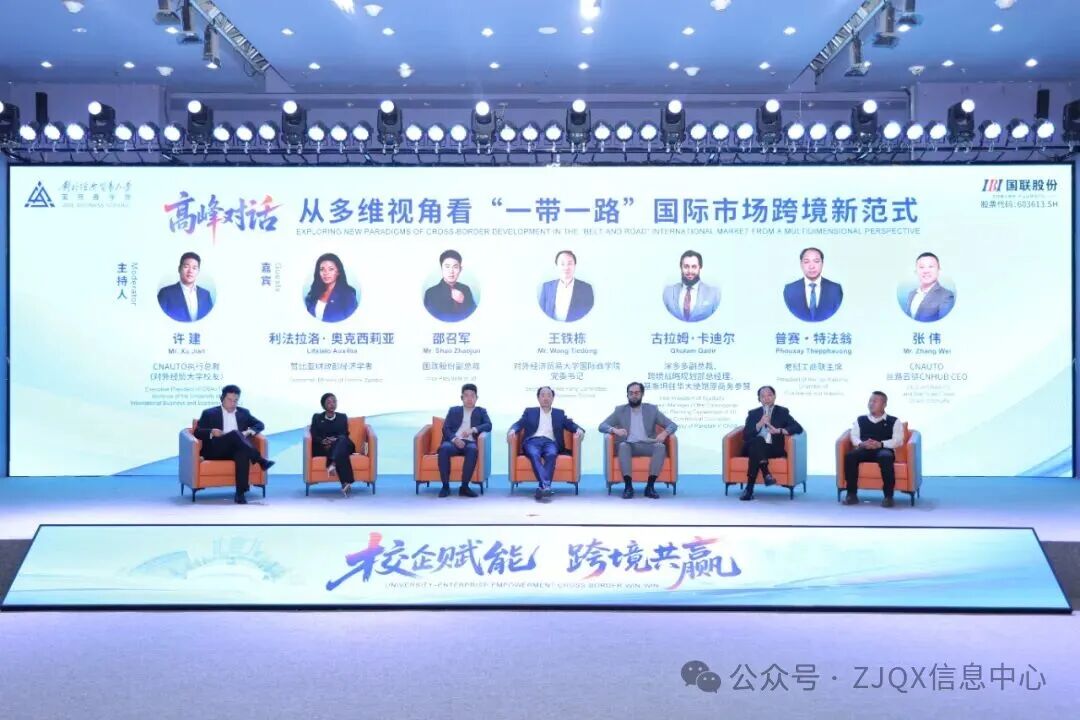高峰对话环节由CNAUTO执行总裁许建主持,对外经济贸易大学国际商学院党委书记王铁栋,老挝工商联主席Phouxay Thepphavong,赞比亚财政部经济学者Lifalalo Auxillia,国联股份副总裁邵召军,CNAUTO CEO、丝路云链CNHUB总经理张伟,涂多多副总裁、跨境战略规划部总经理、巴基斯坦驻华大使馆原商务参赞Ghulam Qadir等嘉宾共同参与,围绕“从多维视角看‘一带一路’国际市场跨境新范式”展开深度交流。对话从政策、学术、产业、国际协作等多角度切入,为“一带一路”沿线国家跨境贸易的创新发展提供了系统性的思路与解决方案。