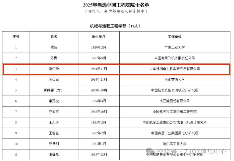 11月21日,中国工程院公布了2025年院士增选结果,中国中车首席科学家冯江华当选中国工程院院士。