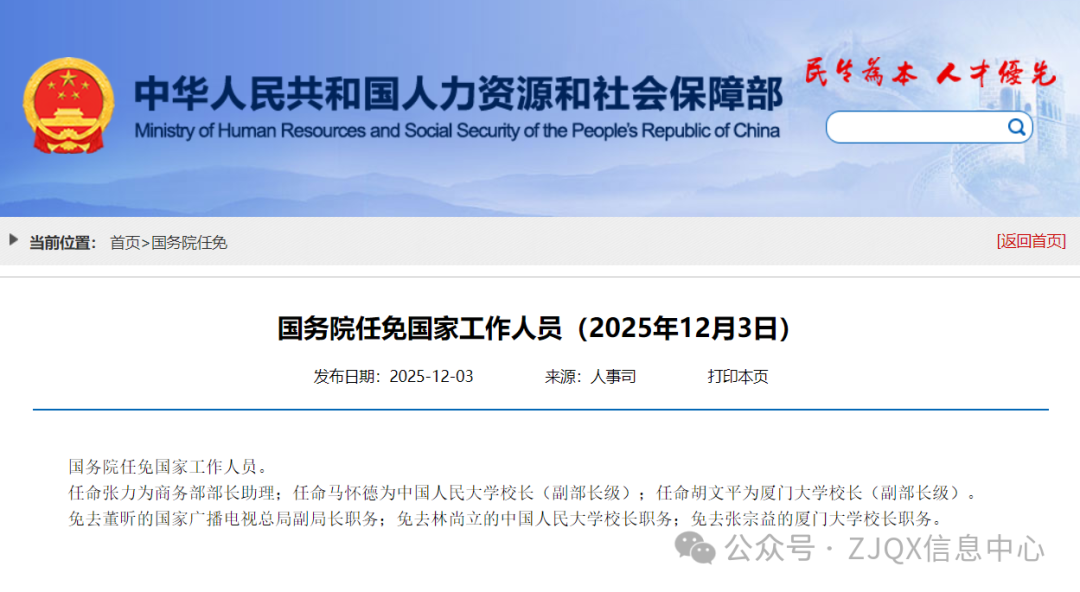 人事任免|张力任商务部部长助理、马怀德任中国人民大学校长(副部长级)、胡文平任厦门大学校长(副部长级)