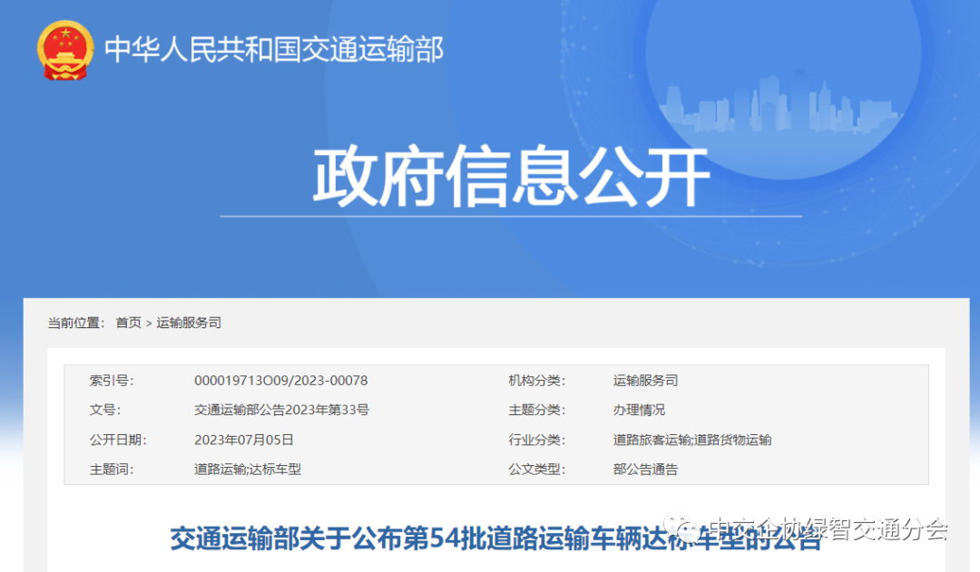 交通运输部关于公布第54批道路运输车辆达标车型的公告