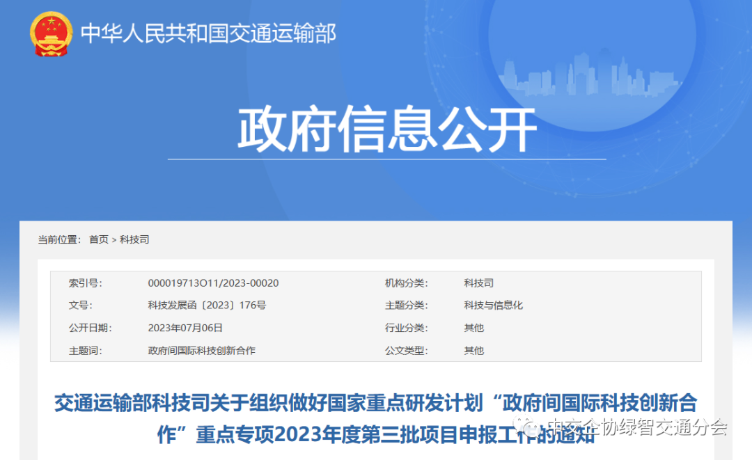 交通运输部科技司关于组织做好国家重点研发计划“政府间国际科技创新合作”重点专项2023年度第三批项目申报工作的通知