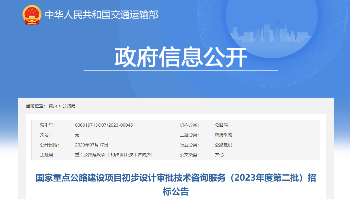 国家重点公路建设项目初步设计审批技术咨询服务(2023年度第二批)招标公告